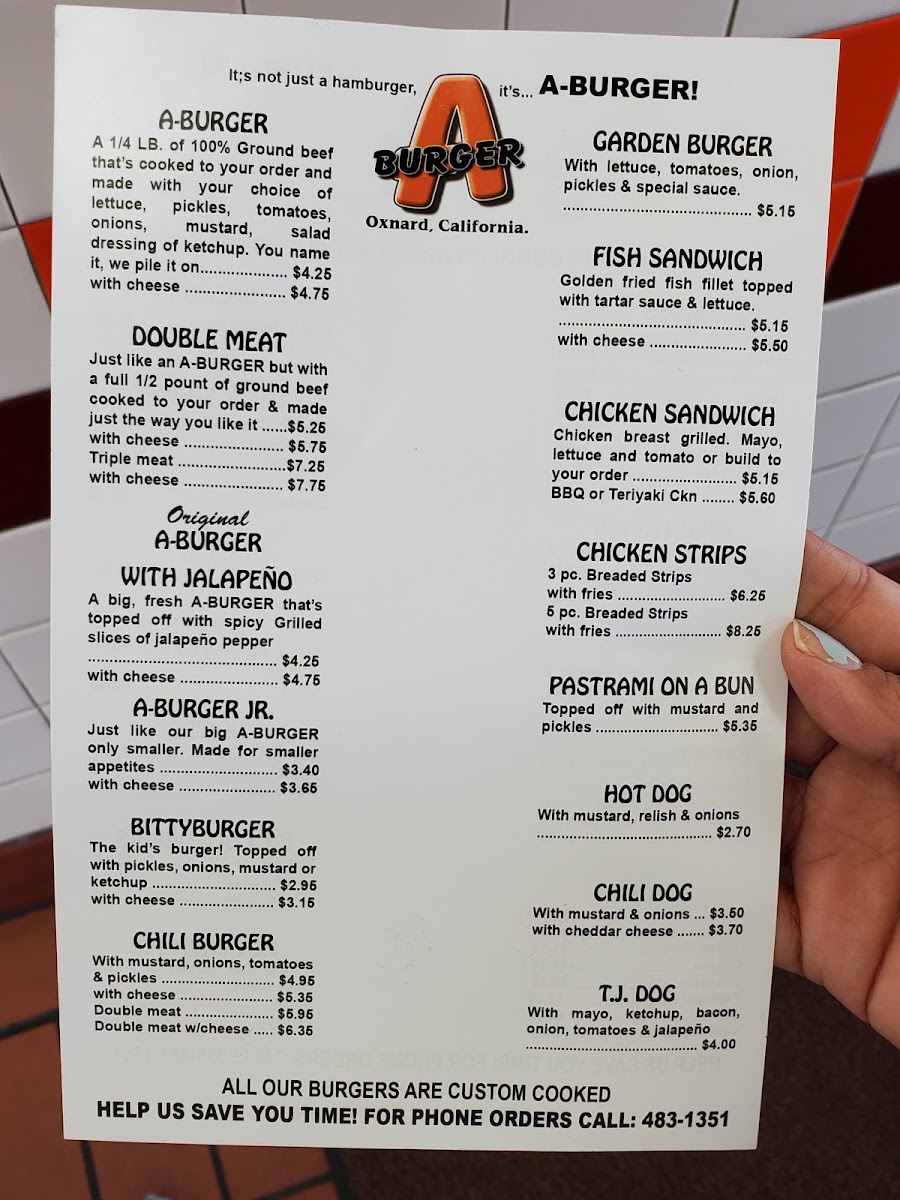 Welcome to A-Burger, the gem of Oxnard serving up classic, mouth-watering hamburgers that evoke nostalgia and satisfaction. Nestled at 155 S Oxnard Blvd, this bustling spot is renowned for its 100% ground beef burgers cooked to perfection. The A Burger, priced at just $7.15, delivers robust flavor with your choice of fresh toppings. For little ones, the Bitty Burger at $5.30 is a delightful treat.